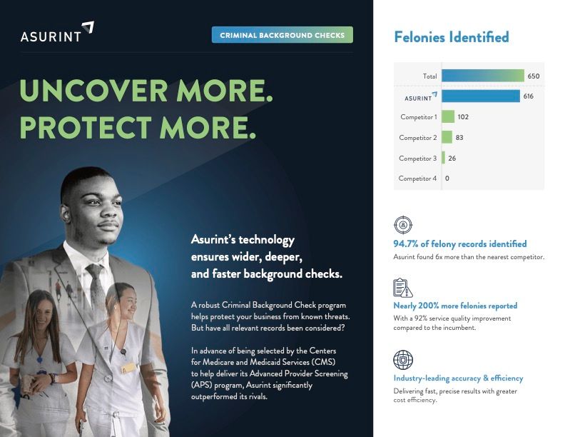 Asurint supports the public agency enrollment of healthcare providers by identifying exclusionary criminal records and sanctions in the CFR requirements.